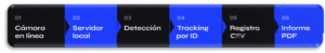 El núcleo del sistema es un modelo de detección de objetos entrenado específicamente con imágenes de los artículos del cliente, capturadas en sus condiciones reales de iluminación y ángulo. Sobre la grabación de vídeo en directo, el modelo identifica cada artículo y un algoritmo de tracking asigna un identificador único a cada objeto detectado.