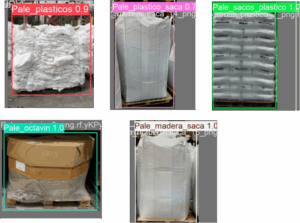 Las siguientes imágenes muestran el sistema en funcionamiento durante la fase de validación. En cada fotograma, el modelo identifica los artículos presentes en la escena y dibuja un recuadro delimitador (de color) con la clase detectada y el nivel de confianza asociado.